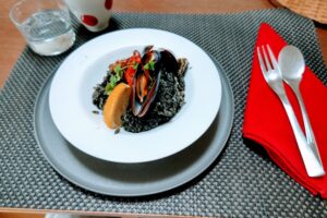 お昼は、「イカ墨パエリア」です